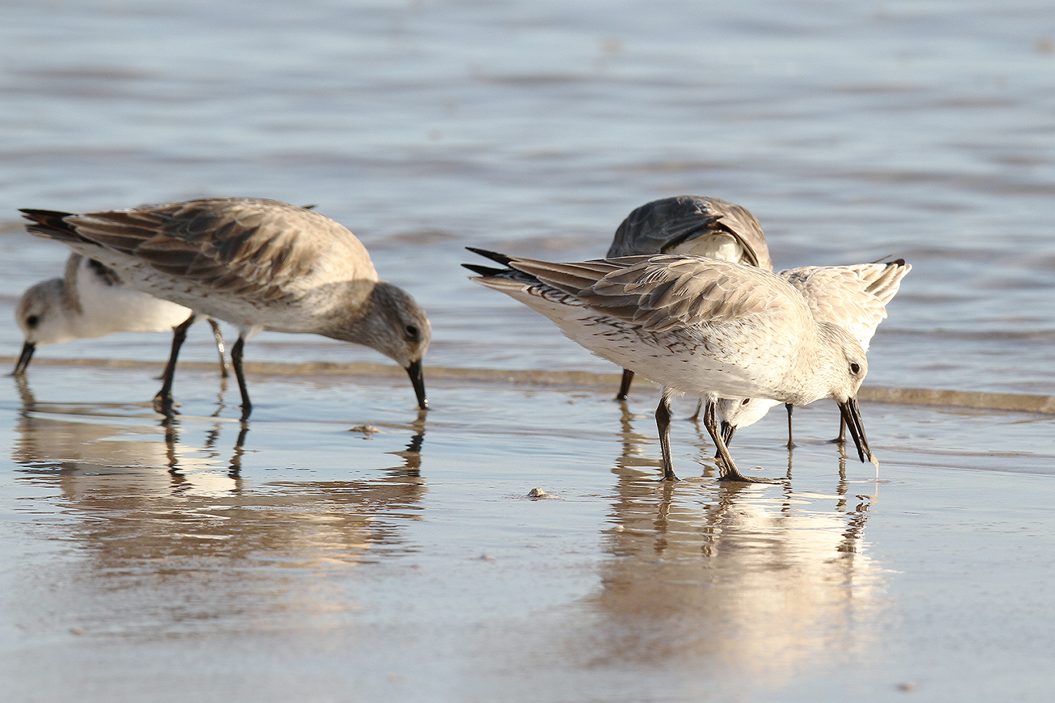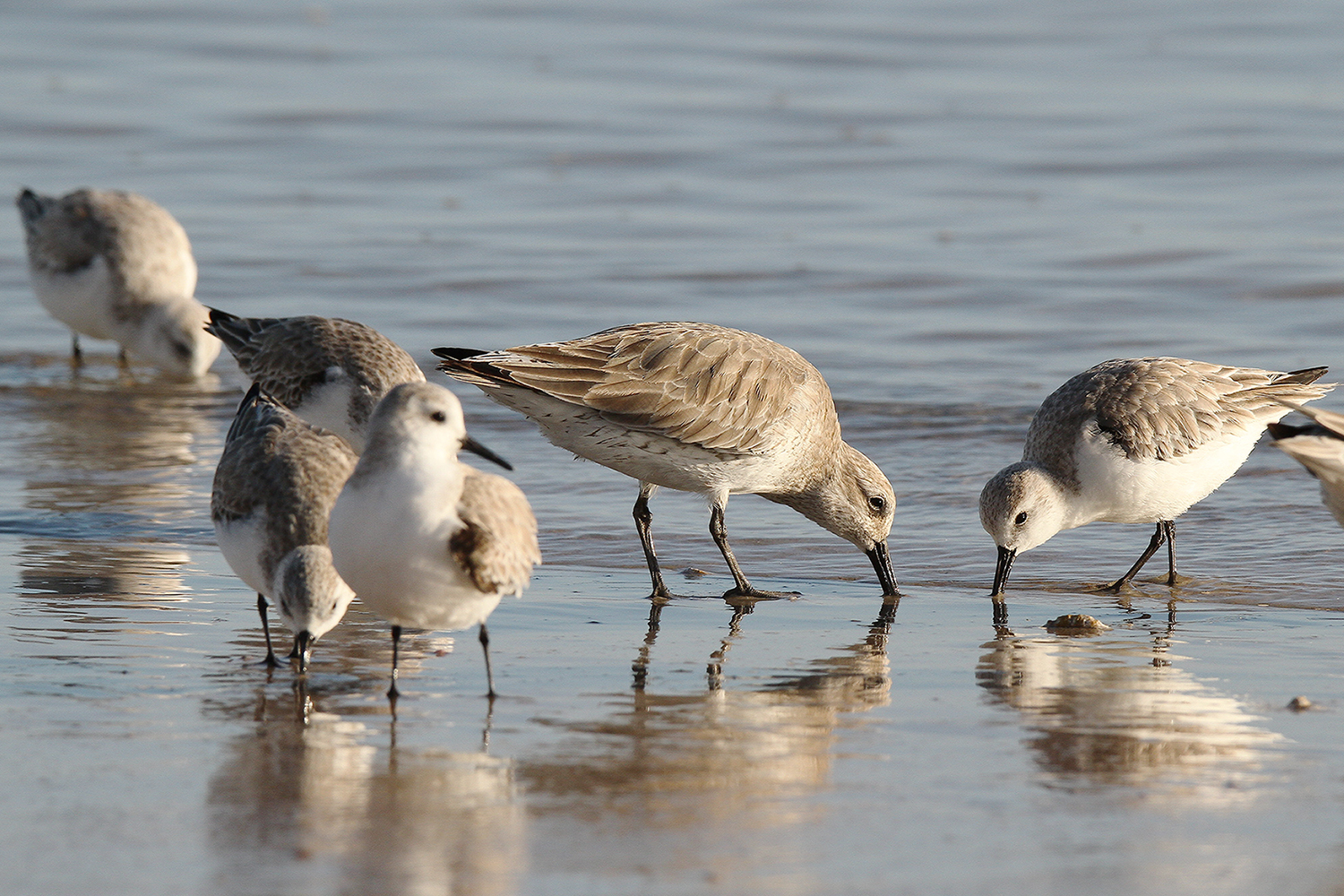 함께 있는 세가락도요 / Calidris alba / Sanderling 의 2아종 중에 우리나라를 찾는 아종은 Calidris alba alba 일까 Calidris alba rubida 일까? 사진의 개체들은 미국에서 보았으니 rubida ~